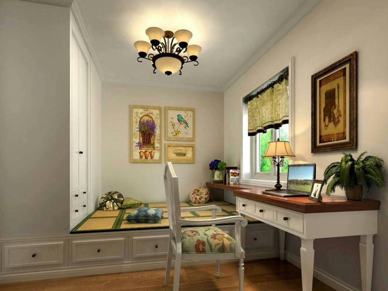 书房顶面同样运用了石膏线,简单一致。墙面稍调了一个浅咖的颜色,显得不那么单调;地面同样采用纹理性较强的实木地板,灯的选用同样与整体风格相协调;衣柜,榻榻米及书柜一体的设计使整个书房整齐又敞亮;窗帘装饰画及陈设品同样给人增添了乐趣,让整个书房给人一种淡雅别致的感觉。