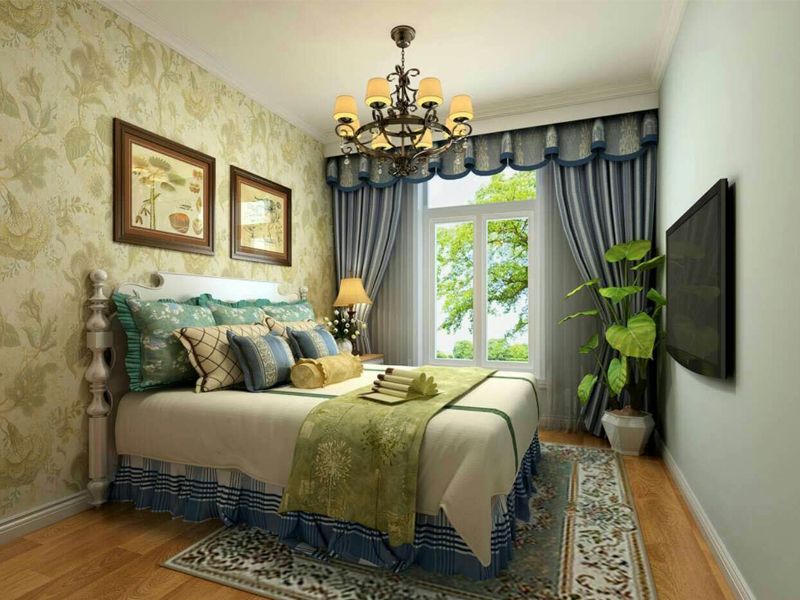主卧顶面采用石膏线,简单朴素;电视背景墙面单独调为淡蓝色,给人一种宁静的感觉;床头背景墙同样粘贴乡村风格代表性的大花壁纸,与其他墙面形成鲜明的对比;地面采用纹理性较强的实木地板,沉稳又不乏味;灯的选用与整体风格相协调;床的选择巧妙的与整个主卧空间融合在一起,富贵优雅;窗帘,绿植及床头背景装饰画同样增添了乐趣,整个主卧给人一种舒适放松的感觉。