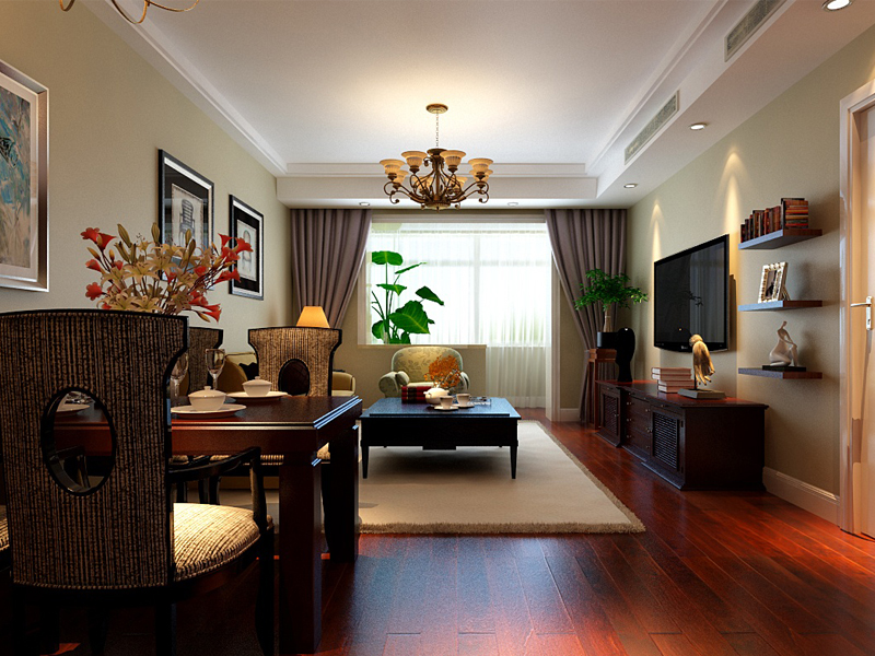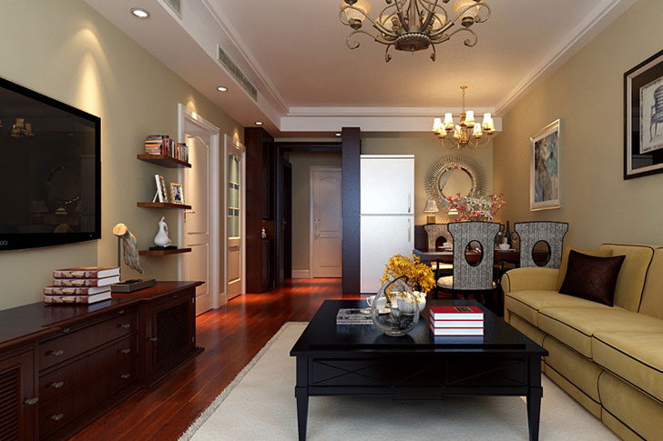 设计上采用三人位卡其色质地较软沙发,搭配深色茶几及电视柜,整体感觉不单一。顶面采用石膏板造型吊顶,墙面刷浅咖色的乳胶漆,地面满铺深色高级强化地板。巧妙利用陈设品及装饰挂画点缀整个空间。