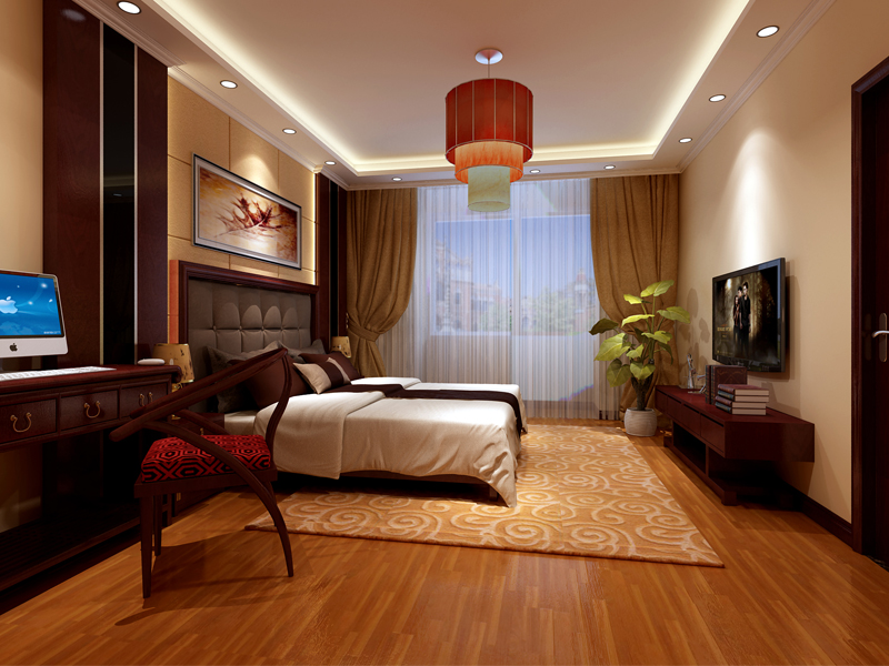 顶面采用现代代表型的回字形吊顶,墙面刷暖色调的乳胶漆,地面铺贴区别于客餐厅的实木地板。家具同样选用深色系列,灯具选用男业主偏爱的款式,整个空间沉稳又不失一种格调。