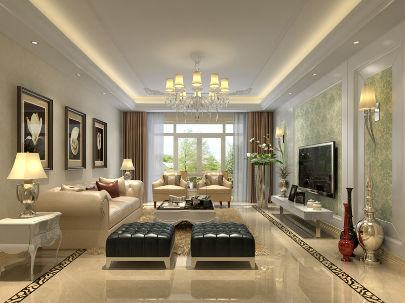 客厅:整个客厅吊顶采用石膏板跌级造型顶及石膏角花的搭配,辅光源用白色自然光,主灯用暖色光色,使整个空间和谐宁静。电视背景墙采用小碎花壁纸与石膏线条相结合的装饰。地面普铺全抛釉仿玉石砖,整体一周用拼花波打线使整个空间看起来不那么单一,砖的光泽感使整个客厅更有人情味。沙发背景墙的装饰画及陈设品突显出不同的韵味儿。