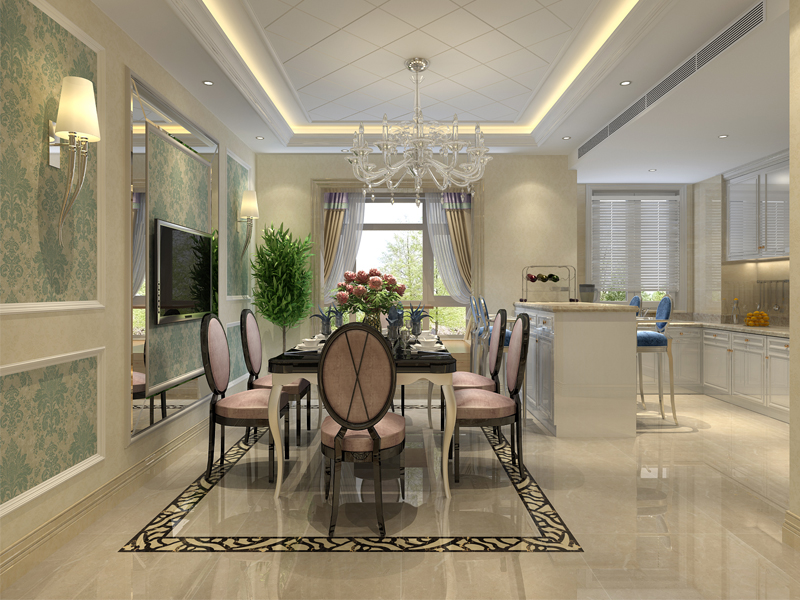 餐厅区域设计6人位餐桌及小吧台,增加一种情调。整个客厅吊顶采用石膏板跌级造型顶及石膏板抽缝的搭配,光源用白色自然光,提供良好的就餐环境。餐厅背景墙采用小碎花壁纸,石膏边框与银镜相结合的装饰,是整个餐厅的亮点。地面同样普铺全抛釉仿玉石砖,整体一周用拼花波打线使整个空间看起来不那么单一。恰好的绿植点缀整个空间。