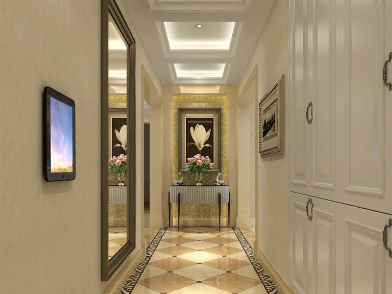 门厅:采用带角花的斜铺的全抛釉地砖及波打线铺贴,让人回到家后一种愉快的心情,正前方放置矮凳,花瓶及装饰挂画就是一道端景,点缀整个空间。