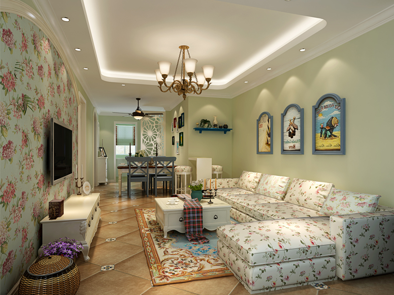 客餐厅顶面运用了石膏板直线反光顶,四周倒成圆角,给人一种整齐又不失单调的感觉;客餐厅墙面特意调制了一种淡淡的绿色的墙漆,给人一种清新温馨而又富有生机的感觉;地面采用经典的仿古砖,耐脏又不容易过时,给人一种复古高贵的感觉,同时又采用斜铺的方式,整体突显出客餐厅的与众不同;电视背景墙外框采用石膏弧形线条里面粘贴经典小碎花壁纸,与整体风格相呼应;客餐厅吊灯的选择使整个空间更和谐;餐桌茶几及电视柜就采用白色混油家具,简洁大方;除此之外,沙发装饰画,挂饰物及一些隔板陈设品增添整个空间的乐趣,给人一种温馨的感觉。