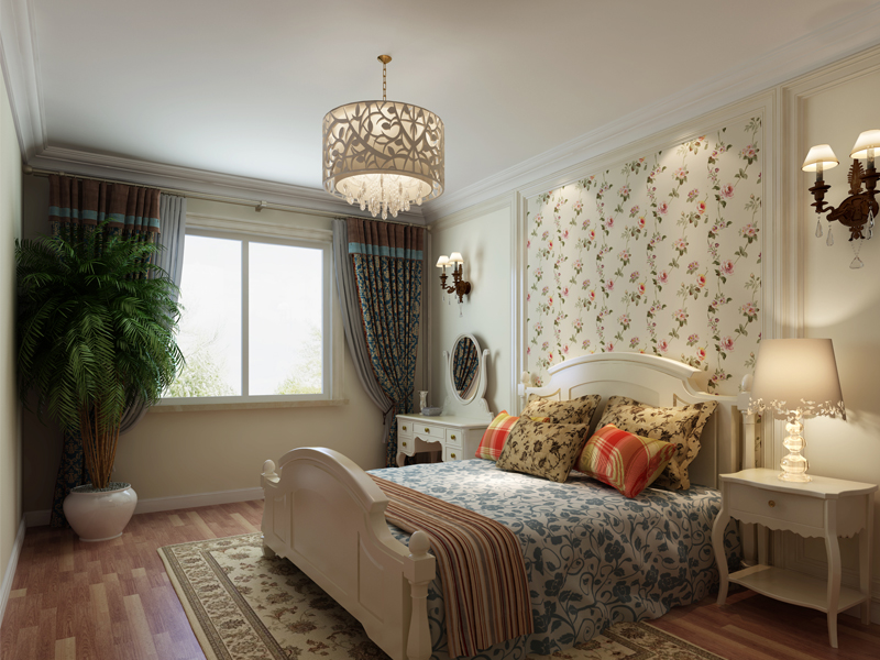 应男女业主的要求放置1.8M*2.0M的双人床、梳妆台、储物的衣帽柜。顶面采用石膏线,简单朴素;墙面整体调成淡淡的浅浅的黄色,给人一种宁静的感觉;床头背景墙外框同样采用石膏线条,里面粘贴与客厅电视背景一样的乡村风格代表性的小碎花壁纸,与其他墙面形成鲜明的对比;地面采用拼接性较强的实木地板,沉稳又不乏味;壁灯及主灯的选用与整体风格相协调;床的选择巧妙的与整个主卧空间融合在一起,富贵优雅;绿植及窗帘的选择让整个主卧给人一种舒适放松的感觉。