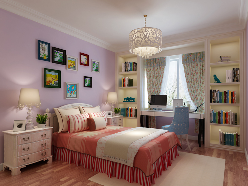 在靠近窗户的位置,设计了书桌的位置,两边都是从上到下的通体书柜,顶面同样采用石膏线,简单朴素;墙面刷淡粉色乳胶漆;给未来的宝宝一种公主的城堡的感觉;地面同样采用拼接性较强的实木地板,沉稳又不乏味;灯的选用与整体风格相协调;窗帘,床头背景装饰画参差不齐的摆放同样增添了乐趣,整个儿童房给人一种活跃清新的感觉。