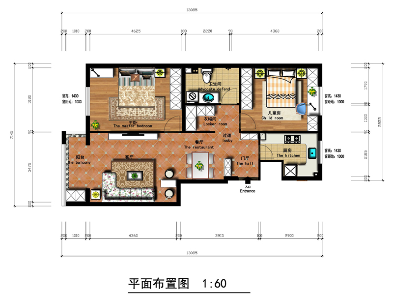 一进入户门在门的正前方设计了一个装饰矮柜,给人一种眼前一亮的感觉,在入户门的左手边设计了一个玄关鞋柜,镂空花格,划分了一下门厅和餐厅的区域,心里上给人一种神秘感。在客餐厅中间设计了两个人坐的小吧台,男女业主可以在休闲时在上面喝喝红酒聊聊天,也是别有一番韵味。除此之外,在原来过道的位置,现在重新加了墙体,做成了一个L型的衣帽间,把空间整体充分利用,又增加了储物空间;阳台上同样一个储物柜,满足了男女业主足够的储物功能,同时阳台地面设计了15公分宽度的鹅卵石,打破了空间的传统型,让人不会有视觉疲劳的感觉。