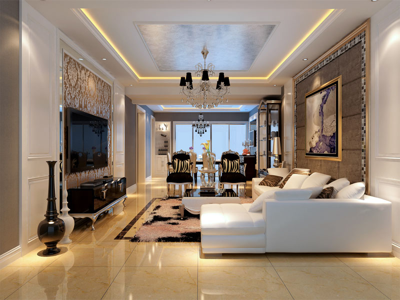客厅从全局来看,以黑白色为主,体现了主人时尚、低调的气质,陈设主色调以黑白色斑马纹为点缀,白色护墙板配上现代的白色皮沙发再点缀上两把黑白色调斑马纹的奢华椅子,给予这个空间时尚大气的感觉。