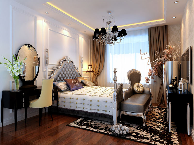 主卧的大四柱高床和美人踏是女主人的最爱,米黄色的团色壁纸、顶面四周的灯池吊顶配上石膏欧式素线、白色的欧式线做为背景墙,即能凸显欧式的奢华,又能满足两位主人的小资情调…………
