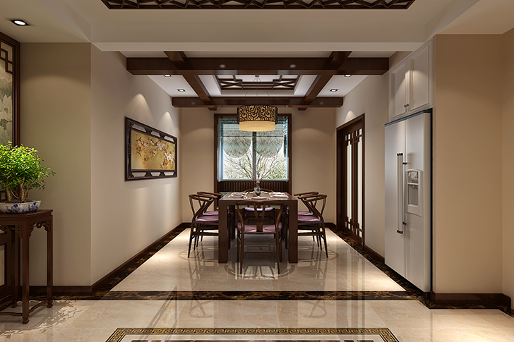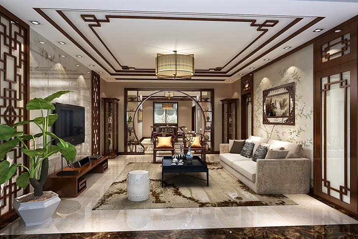 材质的运用上,通体全抛釉瓷砖结合波打线,拼花图案,丰富了地面效果,并形成了一个很好的分区;艺术壁纸的局部运用,使得空间亮点鲜明,主题突出;中式窗花格,实木线条,多宝格月亮门,艺术电视墙,沙发墙,无一不是对中式风格完美的诠释。
