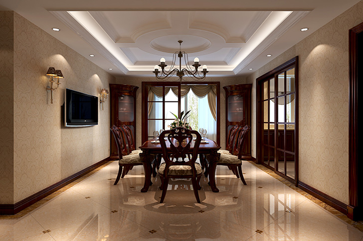 餐厅和客厅地拼的衔接,顶面吊顶的相互呼应,统一中求变化,让两个空间达到很好的一致性,餐厅和客厅也是主人品头论足,会客交友的地方,所以从顶面造型,人造灯光上本案设计师花了不少的精力,就是为了更好的烘托餐客厅就餐会客的氛围。