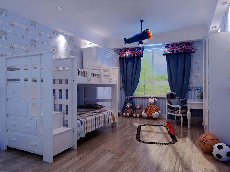 首先儿童房户型规矩,面积适中,给孩子带来一个独立的私人空间,床我采用了上下铺的儿童床,空间的利用率也提高了,同时楼梯有很大的收纳功能。地面选择了具有环保性能的木地板,光脚踩上去有很好的舒适感。窗帘选了小朋友喜爱的蓝色调。整个空间还是很清新充满乐趣的。