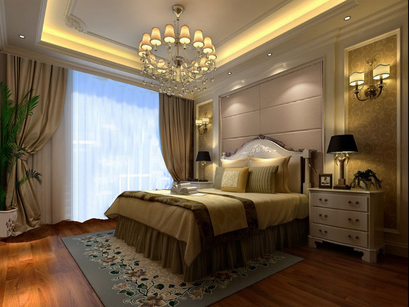 主卧以卡其色为主,有种优雅浪漫丝滑的情感,符合女主人的品味。男主对吊顶的灯带甚是喜欢,所以我做了跌级吊顶配以石膏线和水晶吊灯,使得卧室的顶面立刻丰富起来并具有层次感。床头背景墙采用了对称的手法,配以壁灯,表现男主稳重,内敛的气质。