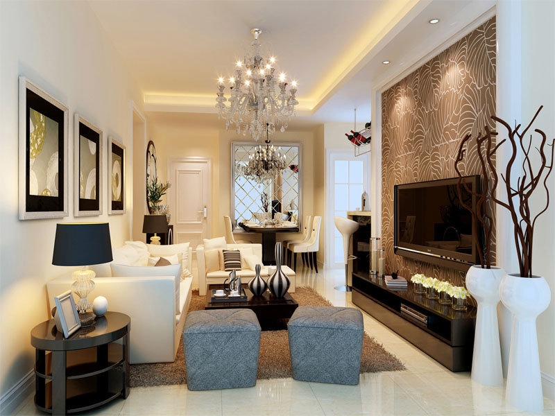 客厅和餐厅在一个空间,并结合吧台的设计很有时尚感,吧台设计还可以做为小书桌增强日常使用率。餐厅的镜面做为装饰,使整个空间有延伸感,再加上水晶灯和装饰画和黑白色调的家居,整个空间温馨、浪漫、时尚!