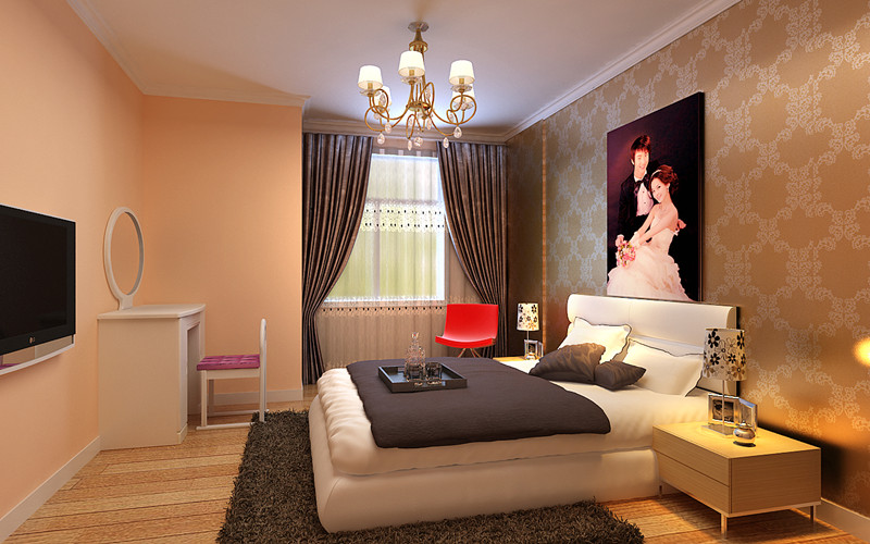 卧室的色彩与客厅互相呼应,卧室空间里没有过多繁琐的造型,反而以简单大方自然来进行设计,设计师考虑到睡觉的舒适度,以自然清新色调为主色调,床头并没有华丽的床头背景,是采取大面积用优美的温馨壁纸来铺贴,顺便再挂上他们的结婚照片,瞬间觉得这便是属于他们的二人小窝,其他墙面则是用温馨的墙漆来做衬托,简单大方的家具和吊顶相结合,使得空间回归到最沉静简洁的原点。