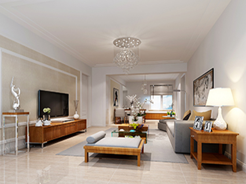 此户型进门是门厅,正常摆放了鞋柜,随后便是客厅,地面整铺白色地砖格外的凸显干净明亮,地面的浅颜色与墙面乳白色的墙漆搭配更加彰显客厅的宽敞,电视背景墙用黄色的壁纸与石膏线条搭配简单而不单调,整体的色调配灰色沙发使整个环境散发少许的活泼感,整体家居上反而选的木色家具,稳重大气。顶面没有做任何吊顶装饰只是安装石膏素线,空间上省掉了许多繁琐的装饰使整个空间干净明亮。整体色调的搭配使家里格外温馨。