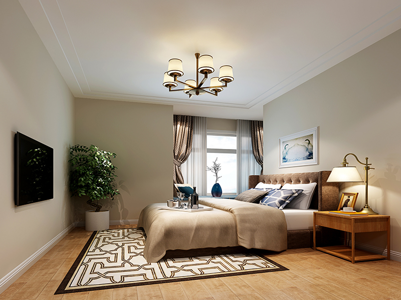 卧室搭配着客厅家居配饰颜色,白色的衣柜以及双人床和床头的配饰都是和谐一致的,卧室的顶面延续了客厅的设计,顶面石膏素线安装,没有在其他方面做过多的不必要的修饰免得适得其反,整个家居配饰通过颜色和造型与整体硬装饰上面的搭配把现代风格的主要特点体现的非常完美。