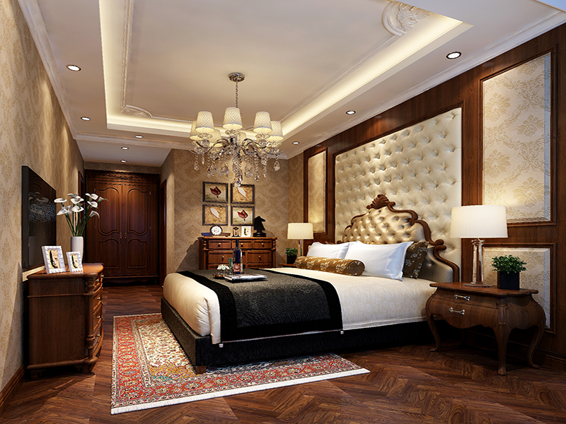 卧室搭配着客厅家居配饰颜色,深色的衣柜以及双人床和床头的配饰都是和谐一致的,欧式的吊顶延续了客厅的设计,所以和客厅基本一致镶贴的边花来装饰,没有在其他方面做过多的不必要的修饰免得适得其反,整个家居配饰通过颜色和造型与整体硬装饰上面的搭配把欧式风格的主要特点体现的非常完美。