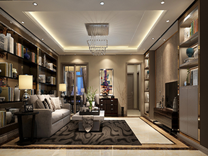 此户型客厅比较大,进门即是一个宽敞的客厅,地面米黄色波打线与深咖色波打线拼接改变了传统地砖的整铺手法,色彩的转变显着客厅明亮宽敞,整体稳重的色调配上深灰色的沙发在这个环境下散发少许的活泼感,整体家居上反而选的褐色家具,稳重大气。本次电视背景墙的设计很独特,由于电视墙边上有一个次卫的门,为了体现背景墙大一些特意把门做成与背景墙一直的板材,包括颜色上的统一使门与背景墙看做一个整体。客厅沙发后面做了一排书柜与电视背景墙的书柜相呼应。整个顶面做直线造型吊顶配用了筒灯,整体色调优雅别致。