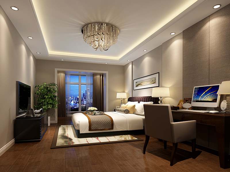 卧室搭配着客厅家居配饰颜色,深色的衣柜以及双人床和床头的配饰都是和谐一致的,卧室的吊顶延续了客厅的设计,顶面直线造型吊灯和安装筒灯,没有在其他方面做过多的不必要的修饰免得适得其反,整个家居配饰通过颜色和造型与整体硬装饰上面的搭配把现代风格的主要特点体现的非常完美。