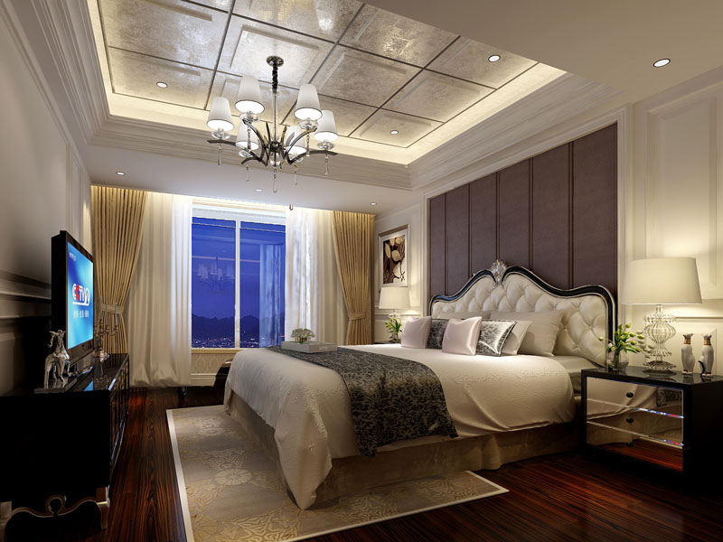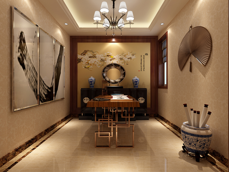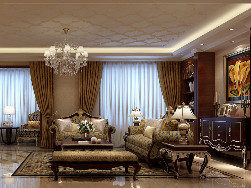 经过与业主及其家人沟通后确定了主色调,以大面积的典雅米色暗花壁纸为主。在客厅、餐厅局部做造型用深色壁纸或壁画来突出主题,使色彩看起来明亮、大方。客厅餐厅属于一层的共享区域,所以用地面的线条设计来清楚的划分区域,突出整个空间的重点,让整个空间符合新古典风格的隆重与贵气。家里本身是比较放松的地方,男主人的要求就是吊顶一定要以简洁大方为主,所以在设计中采用了石膏板跌级灯池吊顶的方式来满足家里的辅助光源,从而使整个空间更加柔和、舒服。客厅电视背景墙采用了实木护墙板,一是与沙发后面的酒柜做出对称的效果,二是使用护墙板更能呼应出新古典风格主题,彰显大宅的气息。