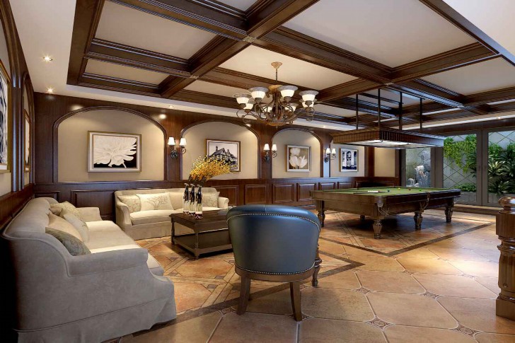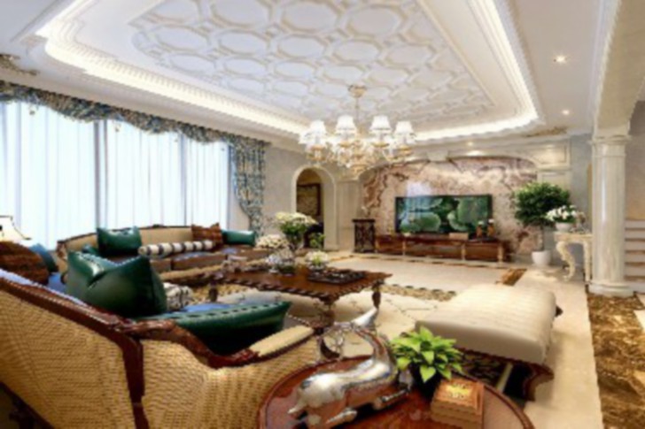 客厅的电视背景墙采用石材拼花造型,并且对于顶部更是有独特的跌级石膏线造型顶,这样的一个搭配会让整个客厅显得更具有美感,木制的沙发曲线配上沉稳的原木色,让整个客厅彰显的豪华大气。