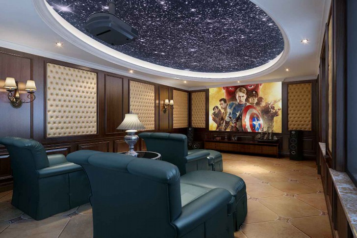 独特的影音室,采用星空顶并搭配着圆形灯池跌级吊顶及石膏线的作用下,可以让我们在观赏影片的同时犹如身处星空一般的感受。