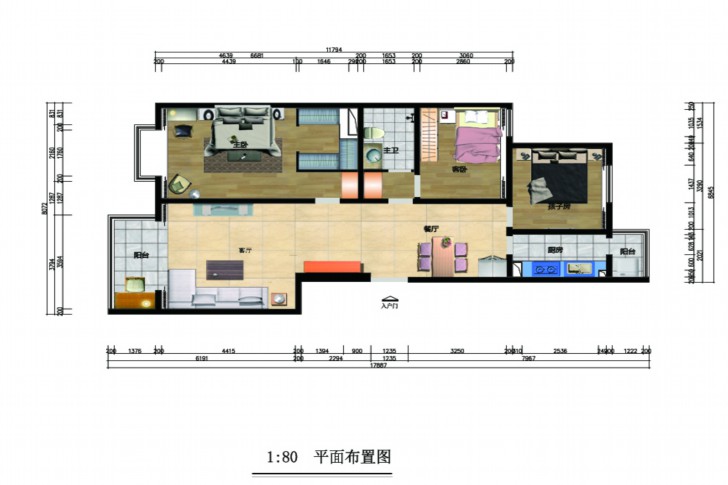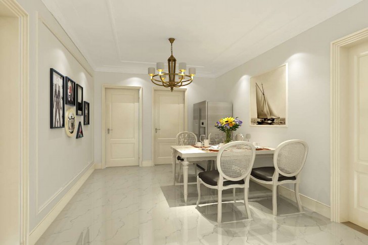 3.“民以食为天”用餐是人生活很重要的一部分,一个舒适的用餐环境会让人拥有好的食欲。所以餐厅的设计也至关重要。餐厅的设计位置与客厅一体,考虑到用餐油迹之类的,所以餐厅选择铺设地砖并在吊顶上采用石膏线进行装饰,很好的展现了主人的生活品味,营造出一个可以带给主人愉快的就餐环境。