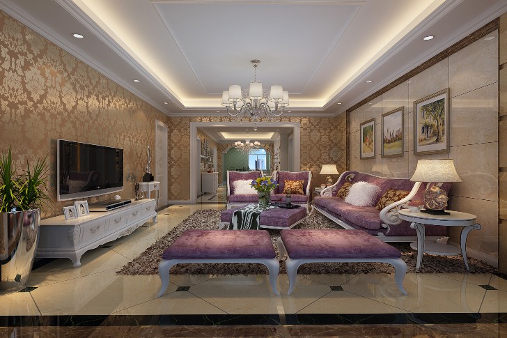 门厅的右边是一个格局方正的客厅,庄重典雅的欧式家具,采用紫色布面处理,此处艳色的运用更添加了浪漫主义的特点,香槟底色的欧式壁纸与米色石材纹路的瓷砖相呼应,深色石材边线收边,将整个空间背景提升到极致。