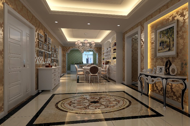 进门迎入眼球的是一个简单而又有层次感的玄关背景墙,直接把你的感觉带入设计的主题,玄关背景以欧式壁纸的色彩跳跃搭配,暗藏反光,再加上一个华丽的玄关台,玄关台的色调又与地面拼花造型色调相呼应,实现了完美的结合。背景墙上一幅雅致的欧式油画,即体现了业主的生活涵养,又可缓和进门后的仓促感。风水上讲:“入门宜有三见”即见红见绿见画。