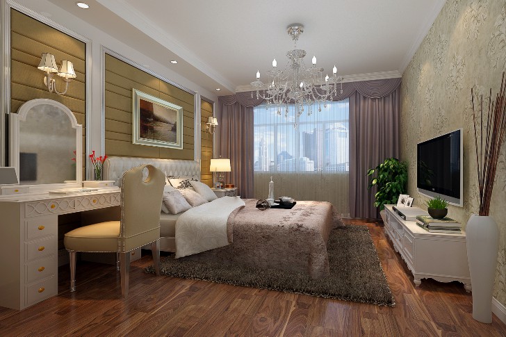 主卧做为房屋主人居住生活的空间,在空间面积受到限制的情况下,装饰效果要端庄素雅、低调不张扬,太过于繁琐的手法要慎用,其使用功能也不容忽视。以硬包做为床头的装饰背景,香槟色纯色无任何花饰背景,给人一种素而雅,而又略显奢华富贵,又以银色实木线条收边,更彰显主人低调不张扬的要求,纯素色的窗帘与床饰为这一特点起到点精之笔。床头天花安装三个LED小射灯,弧线灯光投影在香槟色背景墙上,更是将整个居室的空间氛围烘托到顶点!