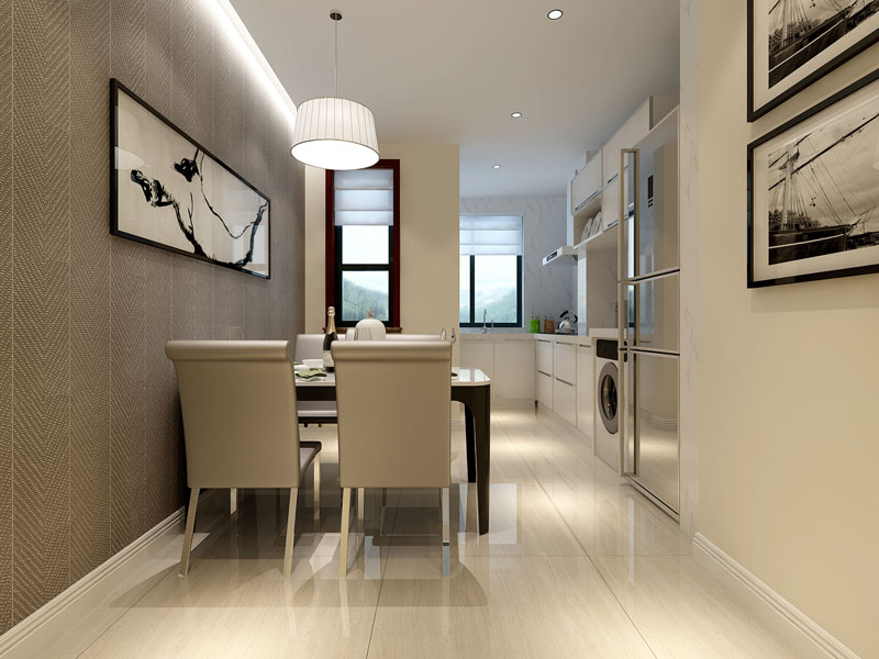 餐厅走廊的框画与客厅统一风格,显得整体,餐厅现代感十足的餐桌干净整洁配以圆形吊灯使人胃口大开,开放式厨房符合女主人方便、宽敞的要求,使得将人们的视觉空间拉大,操作空间增大,通透性更强,干净实用,让烹饪变成一种享受。