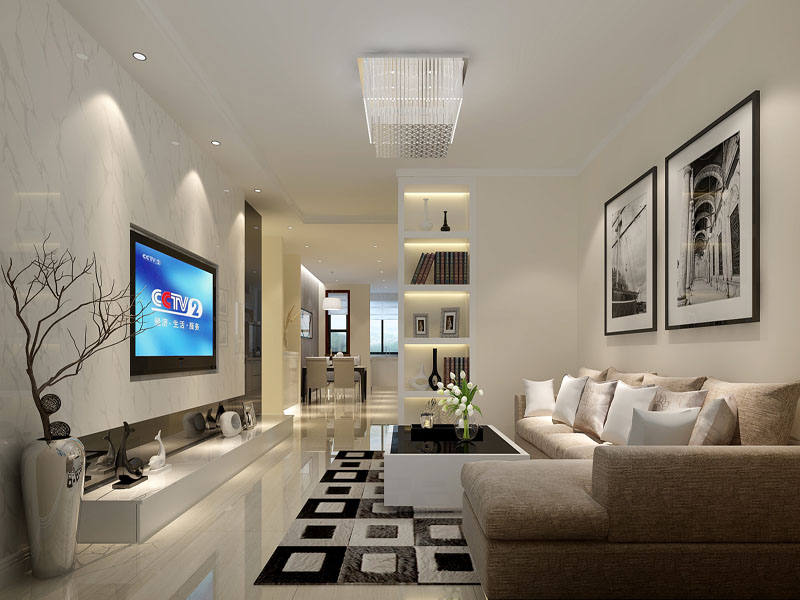 客厅没有运用独特以及复杂的造型,用简单的线条勾勒出温馨舒适的家,空间中使用了黑白米黄三色进行色彩搭配使得整个空间不失品质的同时又充分的体现了简单大方的感觉。米黄色纹理的地面,简单的吊顶区分客厅餐厅走廊,大理石电视背景墙使整个客厅素净的同时又不失时尚感,用素雅的框画点缀整个客厅,配合现代的沙发给人以舒适温馨的感觉。