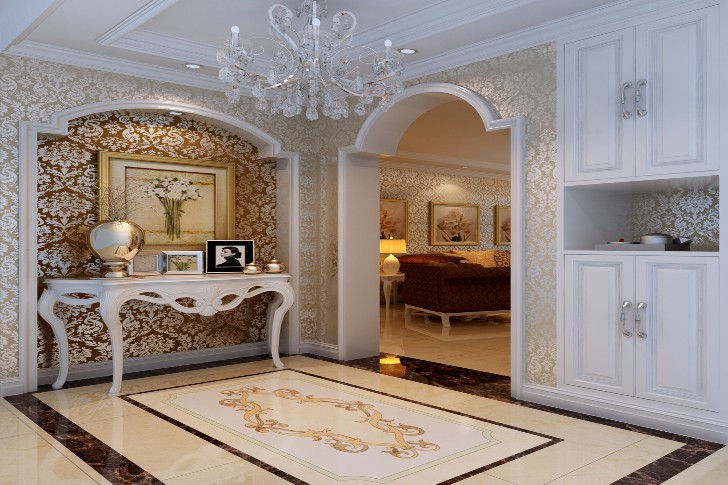 入户门厅的地面拼花与顶面天花吊顶实现完美结合,拱形的垭口套线与质感丰富的欧式壁纸、白色欧式玄关台直接带你进入主题风格。