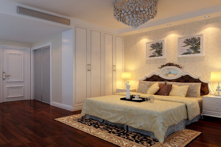 卧室中央空调吊顶、嵌入式衣柜两者空间上的完美结合,墙面涂刷暖色系墙漆,仅以单面床头背景壁纸效果,床头吊顶LED射灯弧形光线,三两幅欧式的小油画,欧式软包靠背床头,两边简单精致的床头小柜上再摆放两盏补充光源的台灯。采用简单实用的装饰手法来烘托卧室的整体感觉。