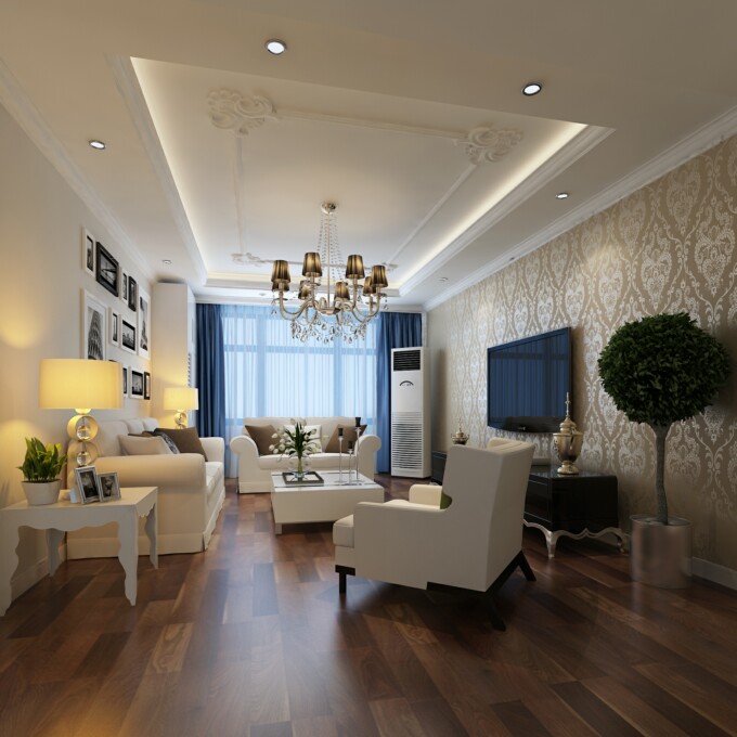 在客厅这张效果图中,地面采用深色木地板,整个空间显宁静,整个客厅墙面选用暖灰色,电视背景墙选用大花壁纸,突显电视背景墙,沙发背景墙简单的白色相框装饰,简洁大方。家居选用皮质沙发,大方高雅易打理。