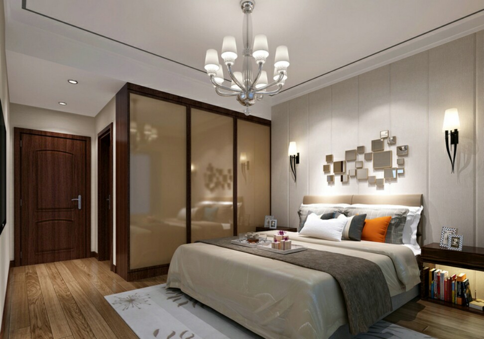 卧室整个空间以灰色调为主,使整个空间显得干净、朴素,又不失现代风格的特色。浅色的木地板是卧室空间的首选,为了配合现代风格,卧室并没有选用复杂的吊顶,取而代之的是石膏线走边,加以黑色线进行装饰,简约中不失层次感。
