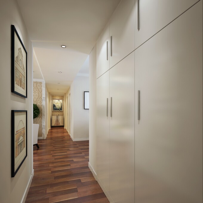 门厅及过道设计简洁,吊顶选用平面吊顶,筒灯光源装饰,玄关处选用白色高柜,设计简洁大方。