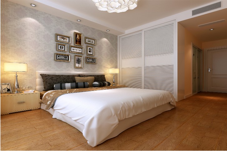 主卧室同样以简约为主,地面实木复合地板使用让卧室显得更加温馨,简约的嵌入式衣柜,简约的卧室床,没有复杂的床头造型,更加体现出了注重实用的特点,床头背景使用了素色花纹的壁纸,吊顶处小灯光的点缀及床头的贴画,更是起到点精之笔。