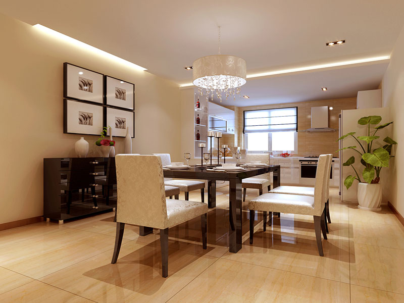 餐厅同样采用米黄色设计,配以柔和的灯光,顶面采用简洁的造型为基础,营造出优雅,舒适的用餐氛围,简约餐桌的采用使整个空间温馨, 实用性更高,半开式厨房的设计满足了女主人要求餐厅操作方便需求的同时与餐厅融为一体。