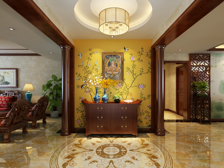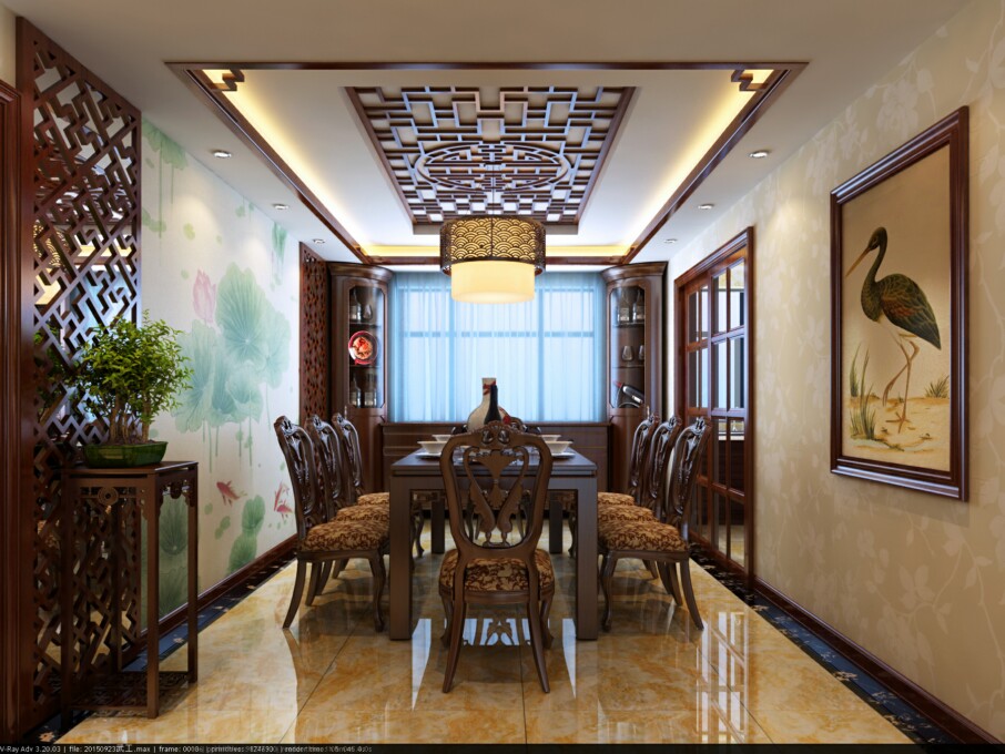 餐厅整体选用中式家具,设计师将次卧设计的更为舒适,在舒适的同时不减温馨。墙面选用荷花壁画,清新自然,壁画两边对称中式花格,简单时尚。在吊顶的处理上干净整洁。餐厅处同样在地砖的选择上选用的是抛釉砖,防滑易打理。