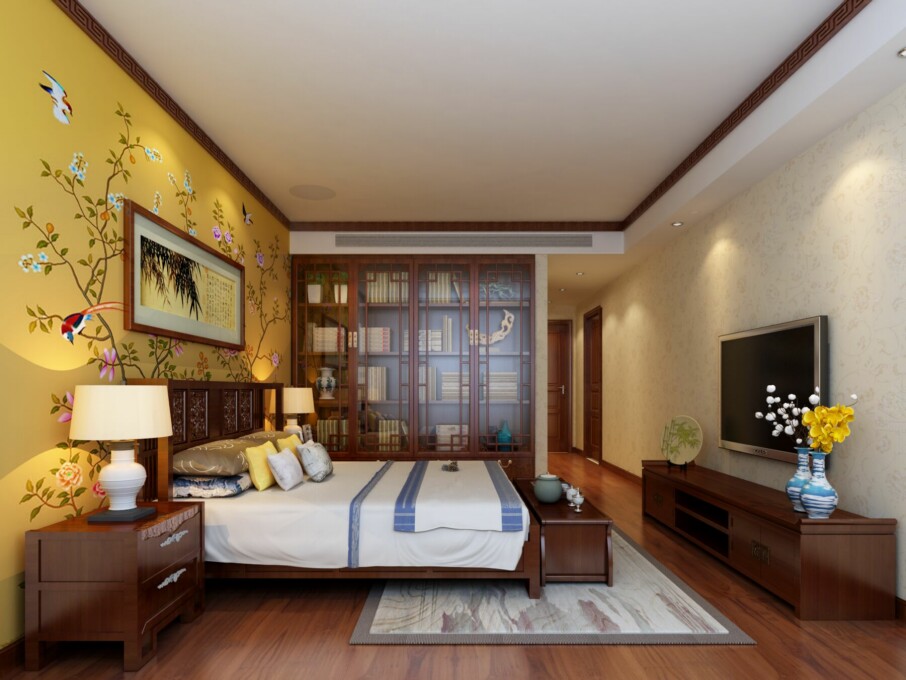 在卧室这张效果图中,整个米黄色的感觉让人很舒适,整个的色调是干净的而且温馨的,设计师用深色中式家具来摆设空间,使得整个空间方正规整。在墙上也做足了功夫,整个的空间用的是米黄色墙壁纸,床头背景墙用青竹装饰画和鸟语花香黄色壁画做背景,使得整个的空间大气,明亮,使得采光等都有很大的提升。在吊顶的处理上简单的用中式回纹线处理,书香气息宁静自然。