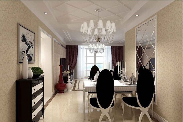 餐厅:餐厅的设计,采用欧式餐桌椅,颜色上和客厅的有差别,再加上简易白的柜子,让餐厅氛围变得明亮而带有一点清新,让餐厅更好的发挥其作用。颜色额分割更能增强空间视觉比例。