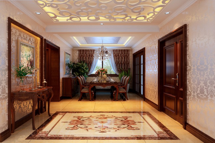 【餐厅】:在餐厅处增加了餐边柜,这样方便主人在进餐的时候,惬意舒适。色调上依然是与白色相搭配,胡桃色的酒柜与餐桌相搭配,在柔和的灯光的照耀下,呼应整体的同时不突兀,空间整体给人一种低调高贵的自然之感;让人感到惬意和主人的浪漫情怀。