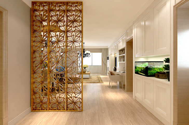 门厅:从入户门进来就一览无余,没有一点私密性,但又不能建墙加以遮掩,这会使其显得堵,因此加以木质镂空隔断,及起到了隔开的作用,又不会显得堵,还有装饰的作用。