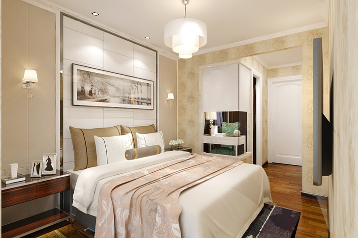 主卧采用简单色,柔和色,自然色为主笔,考虑休憩的功能实用性,加厚的遮光布,暗纹的壁纸,增加睡眠质量,提现温暖情怀。