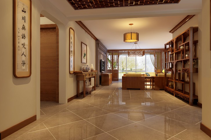 【客厅】:以客厅为例,因为考虑到了业主的生活习惯及个人喜好,所以在用色上并没有选择太过于跳跃、或深沉、或艳丽的色调,而是选用了干净的胡桃色,并且与白色相搭配,再加上灰色的仿古砖的元素,将中式的古典韵味表现的淋漓尽致。既不会显得单调也不会让人感觉沉闷;相反,还会给人一种静谧温馨、舒适的生活感受。色调的相互搭配是本案的一大亮点,白色的顶面在黄色柔和灯光的照耀下,给人一种自然温馨的舒适之感。