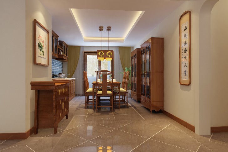 【餐厅】:因为男主人非常爱好品酒,且有收藏的习惯,因此,在餐厅处增加了酒柜,造型上依然是中式柜样式,相互呼应。在主人进餐的时候,斟上一杯香醇的美酒,惬意舒适。色调上依然是胡桃色与白色相搭配,胡桃色的酒柜与餐桌相搭配,在柔和的灯光的照耀下,呼应整体的同时不突兀,空间整体给人一种低调高贵的自然之感;让人感到惬意和主人的浪漫情怀。