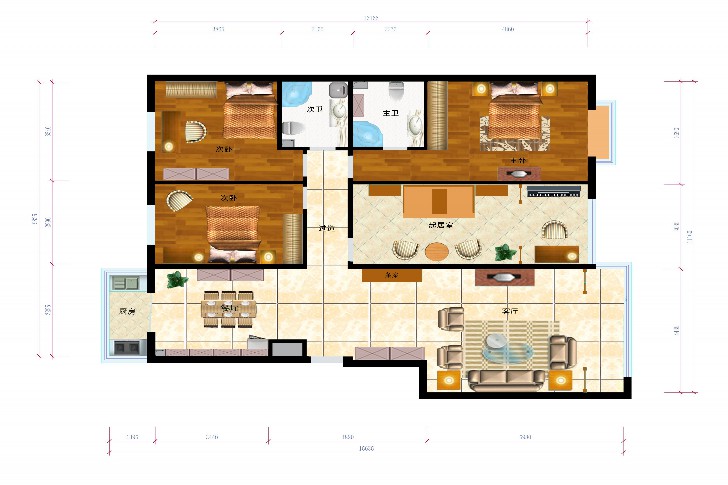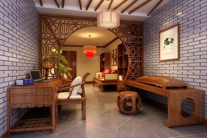 【起居室】:虽然功能齐备,但无任何的收纳功能,因为人们在居家中,随着日常的生活,生活中的杂物较多,若没有足够的储藏空间,不仅会影响到日常生活,也影响了美观。对此,在设计中增加了房间的收纳功能,例如:展示柜、书桌等同时,因为女主人爱好古筝,因此,在起居室用中式韵味浓厚的屏风隔断划分空间,既做到了合理的利用空间,同时也做到了空间的最大利用化,一举双得;提高了整个房间的功能性和舒适性,让人感觉利落舒适、不琐碎;同时也给人一种舒适安宁、温馨惬意的生活感受。