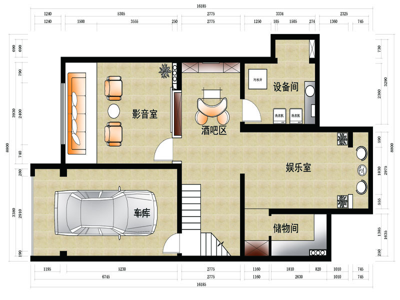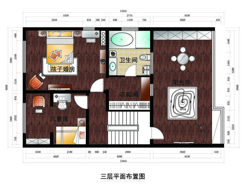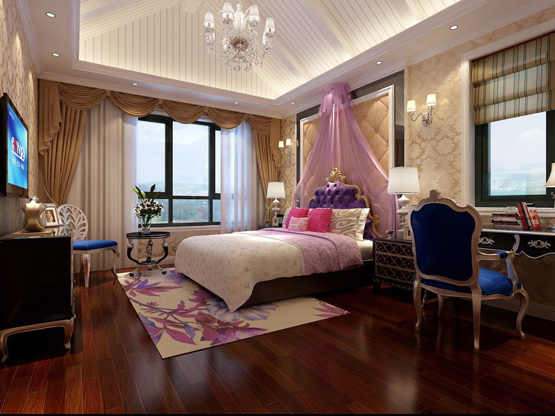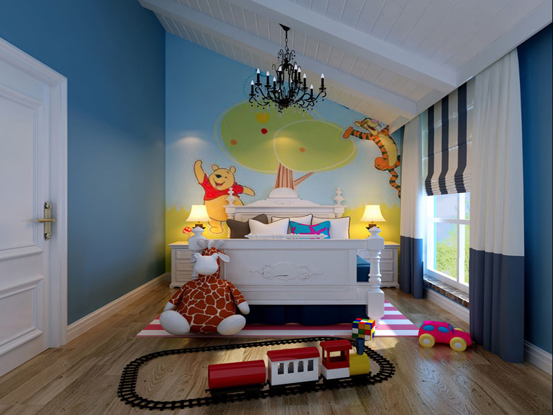 餐厅与厨房是下沉的空间,此处的改动是把餐厅与厨房的墙体拆除,改成一个大的垭口,把原来封闭式的厨房做了一个敞开式的厨房,不仅增强了厨房与餐厅之间的互动又能增加空间感。楼上的主卧室是给孩子作为婚房使用的,所以整个房间的色调是以浪漫的紫色,就仿佛盛开的海棠花,每一处角落里都充满的幸福的味道。顶面的处理是在原来的人字型的顶面做了一些细致的石膏板拉槽,不仅体现了施工工艺更能表现出别墅的韵味。次卧室是给未来宝宝准备的,斜坡顶更能体现小孩子的活泼,床头背景是做了一幅卡通图案的壁画,增加了孩子的童趣。整体的色调是以清新蓝色为主,更能安抚小孩子不安躁动的情绪。
